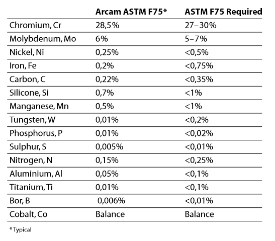 如下表1. 有關Arcam ASTM F75 與ASTM F75的比較表,注意到余量是鈷元素。
