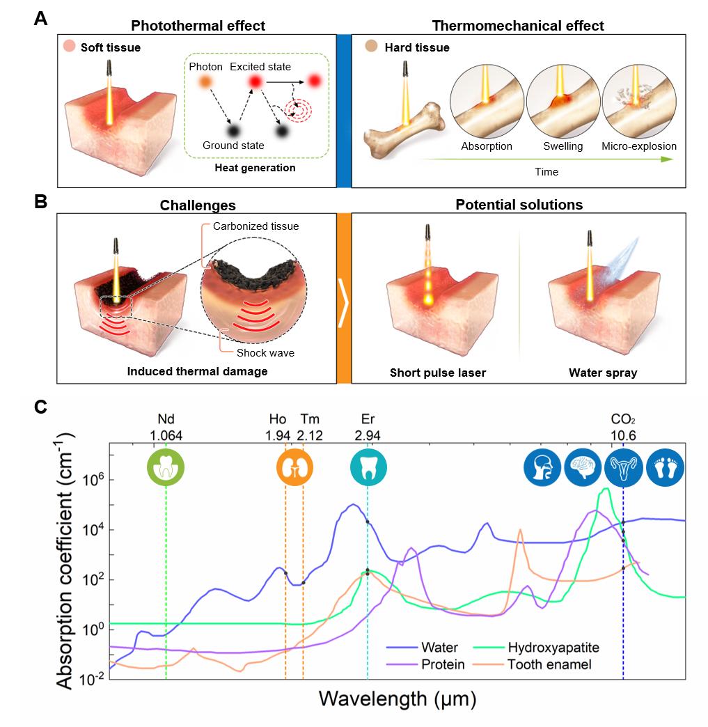 與基于機械加工的傳統手術工具不同,激光手術刀通過獨特的組織光學作用實現高效生物組織加工。文章詳細闡述了針對軟組織與硬組織切除的光熱消融與光致機械消融機理,并討論了水介導和超短脈沖激光技術在緩解組織凝結、碳化等熱損傷方面的研究進展(圖1)。進一步地,文章分析了以Nd、Ho、Tm、Er和CO2激光為主的紅外醫療光源在牙科、泌尿外科等多種手術領域的特點、優勢與應用價值,并強調新型手術激光光源技術的進步給激光傳輸介質在靈活性、穩定性和操控性等方面帶來的巨大挑戰。