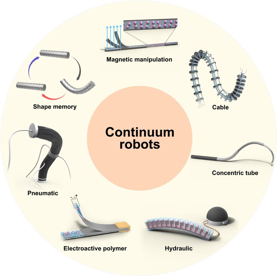 手術器械的精準操控是實現高效微創手術的重要因素。材料科學與生物工程學科的快速發展,催生了驅動方式多樣的連續體手術機器人研究,促進了精準外科醫療發展。文章全面分析了現有連續體機器人的驅動機理與特性(圖3),指出基于磁驅動方式的連續體機器人在安全、精準和智能化外科手術介入中的巨大潛力。此外,文章進一步提出了柔性纖維機器人激光手術刀的概念,激光手術刀與醫療連續體機器人的結合推動了其更為廣泛的臨床應用,這些系統已成功應用于泌尿外科、婦科和耳鼻喉科手術。